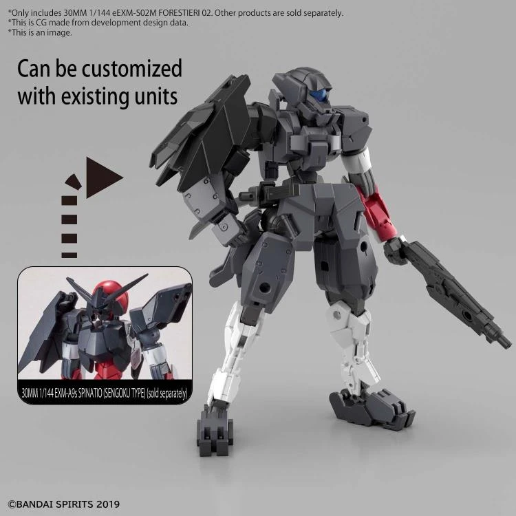 The 30 Minutes Missions series continues with eEXM-S02M Forestieri 02 in 1/144 scale! This set comes with pieces to build a rifle, beam sword, and Roy Roy; the rifle can be attached to the back while the beam sword handle can be attached to the back and thigh. It can be customized with other existing 30MM models for a different look.