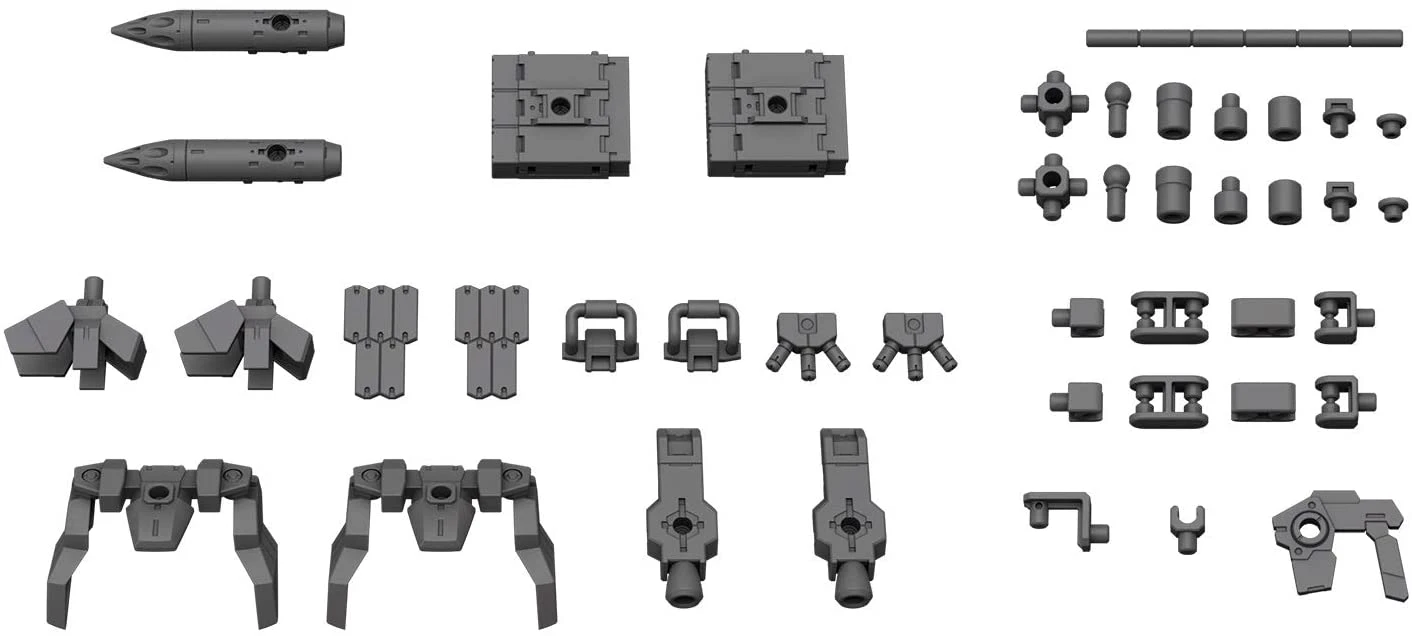 This accessory set includes parts to customize your 30 Minutes Missions models or other model kits! Included in the set is 1 set of side armor, 2 rocket launchers, 2 leg extensions, 2 explosive reactive armor, 2 boosters, 2 hooks, 2 smoke dischargers, 2 missile pods, and various joints.
