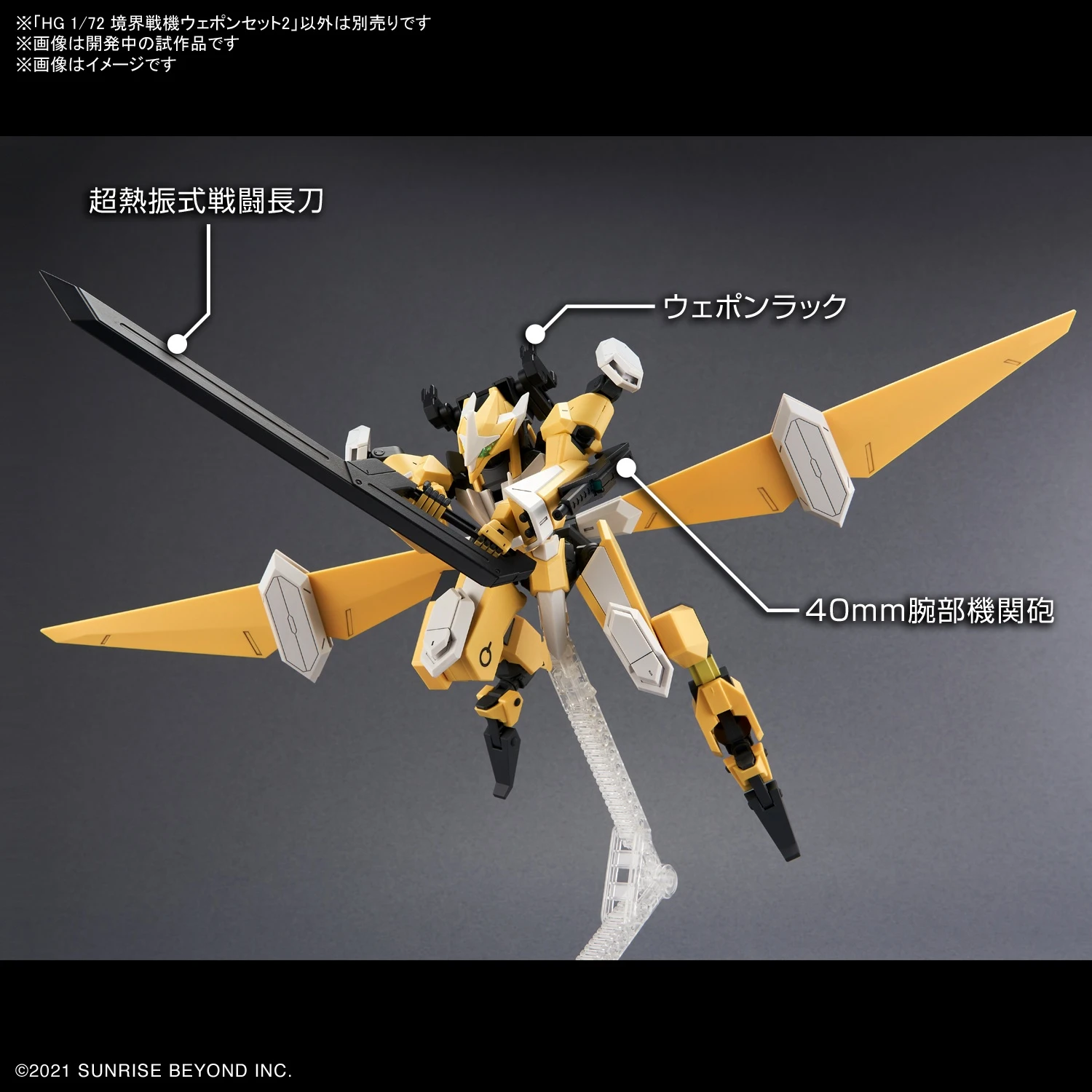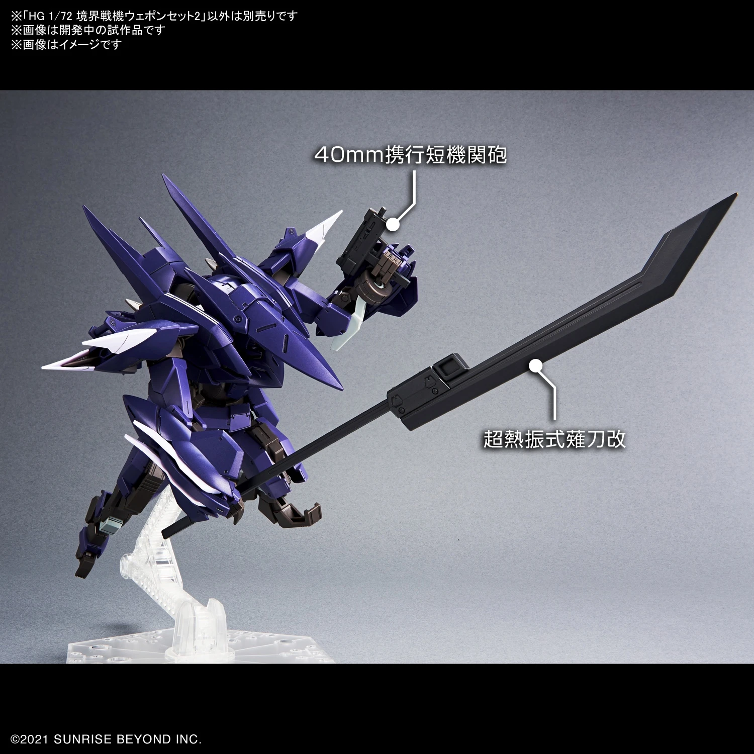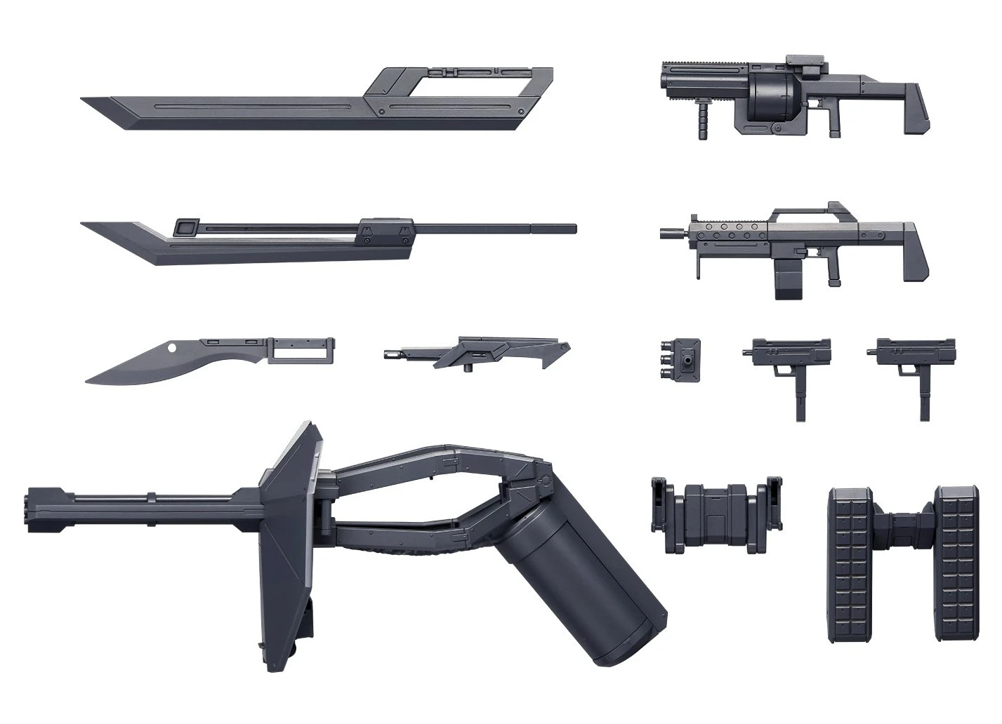 A weapon set that aggregates the armaments of the Kyoukai Senki 1/72 series and allows you to create your own original configurations. Features Super Heat Swing Type Combat Long Sword, Armor Cannon, Submachine guns, Super Heat Swing Xue Sword Kai, Grenade Launcher, and accessories.