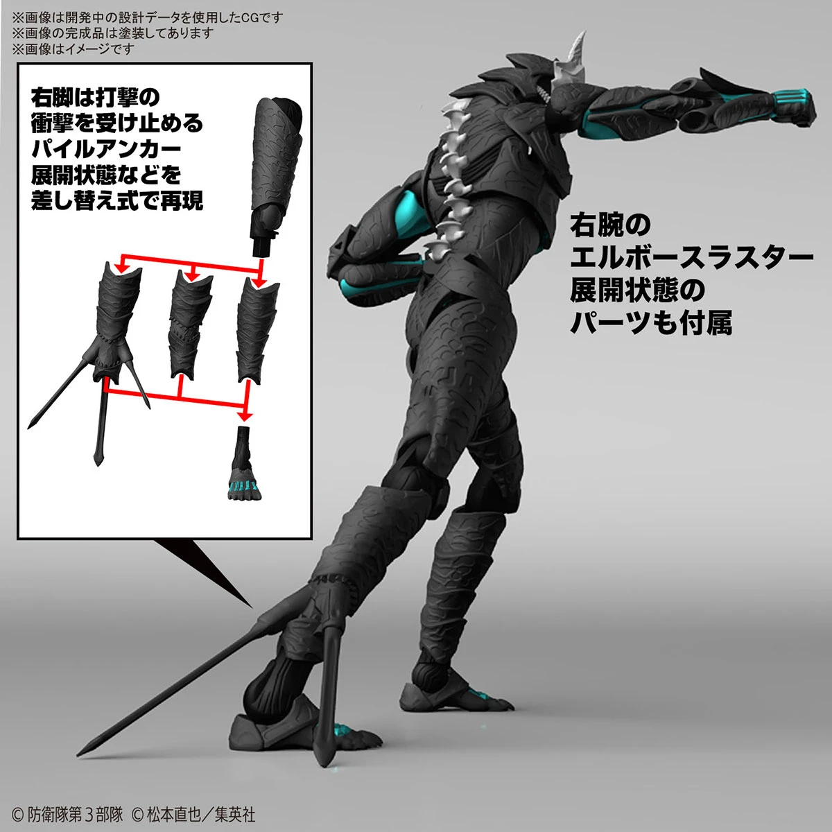 From “Kaiju No. 8,” which will begin broadcasting in April 2024, “Kaiju No. 8” will be full of dynamism with sharp details and bold actions! The chest part is designed to accommodate organic movements, so it has an overlapping structure and can be moved according to the pose. This model also includes 3 facial expression parts: normal, angry, and opening. Be sure to add this Figure-rise Standard Kaiju No. 8 model kit to your collection!