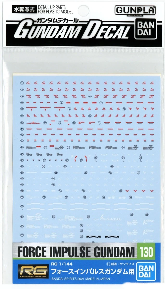The Gundam Decal No.130 Force Impulse Gundam set comes with decals to decorate your 1/144 scale models.