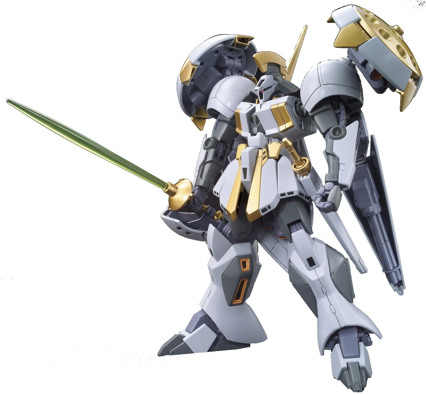 Bandai’s High Grade version of the R-Gyagya from “Gundam Build Fighters Try” features its distinctive round shields, as well as two triangular shields, a beam saber, two twin beam sabers, and two gatlings.