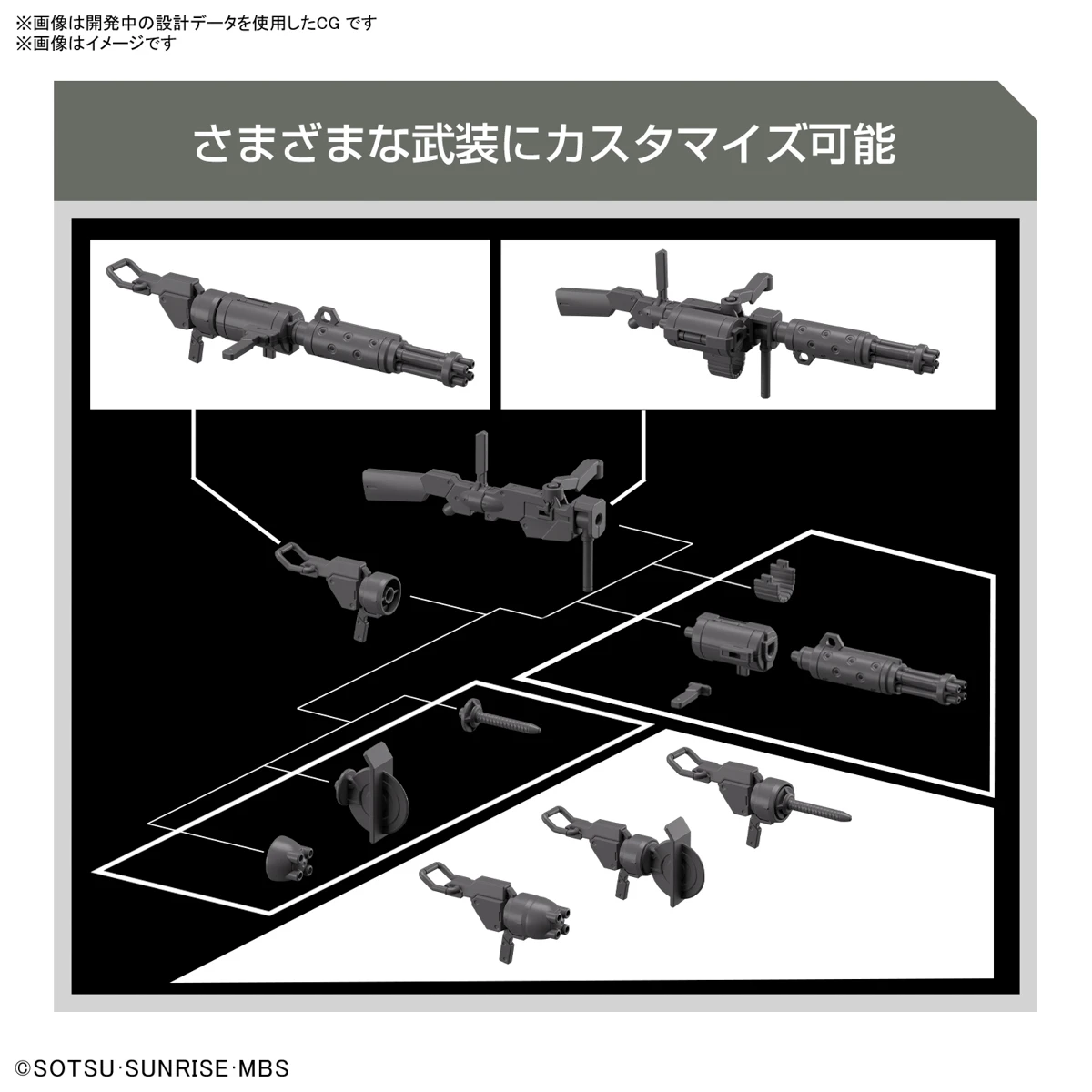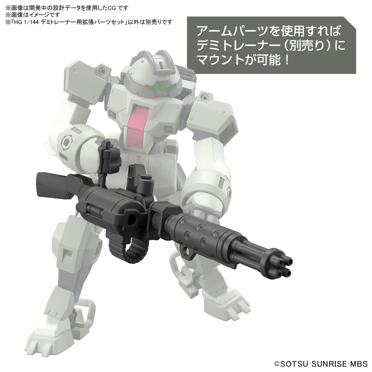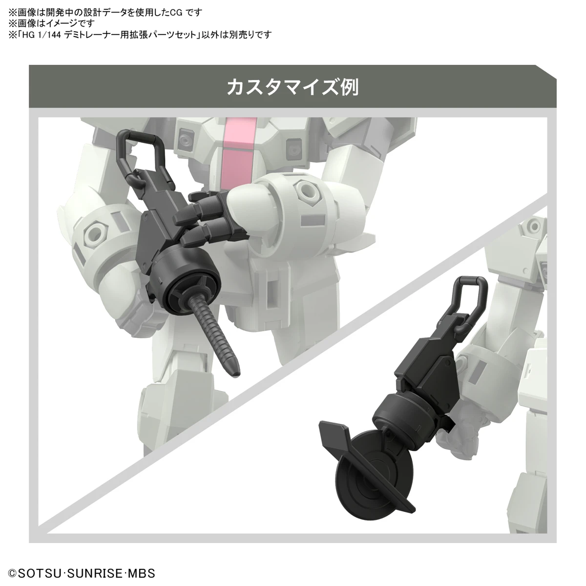 Add onto the Demi Trainer model kit with this matching 1/144 scale expansion set! Part of the High Grade Era model kit line, this set includes pieces to a beam rifle and Gatling gun while also including a combat knife, drill parts, missile launcher parts, and round saw parts.